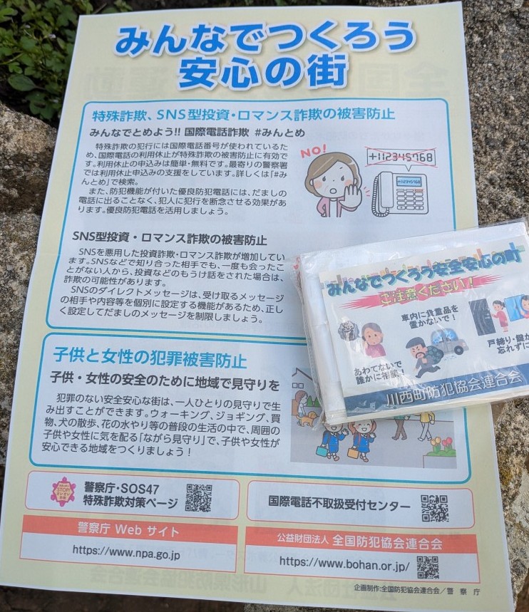 今日は年金支給日ということもあり、参加者は町内の金融機関でチラシ等を配布し啓発活動を行いました。これから年末にかけて犯罪が多くなる傾向があります。家庭内、隣近所で声を掛け合い巻き込まれないようにしていきましょう。